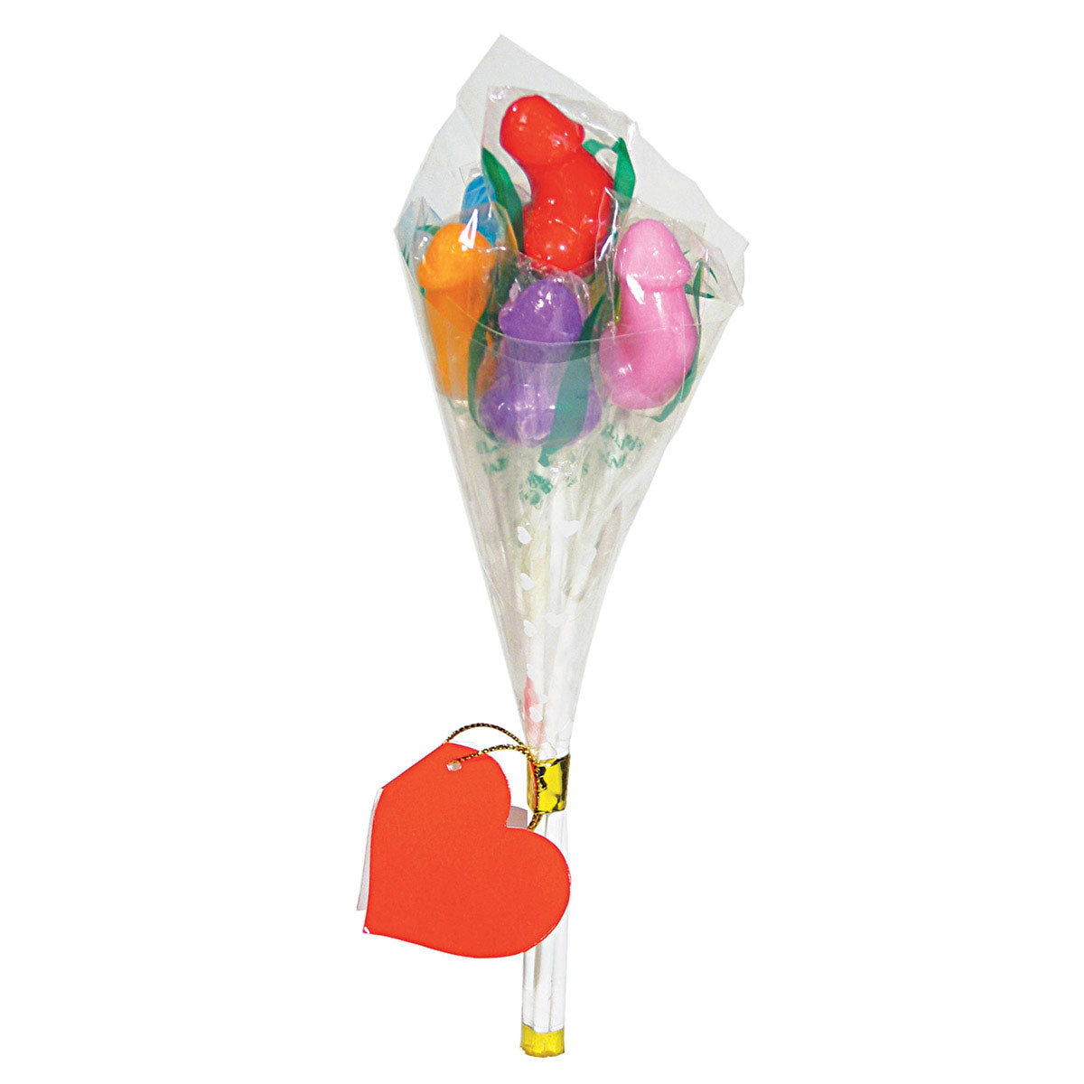 The Penis bouquets from Candyprints are delicious, irresistible, and as cute as cute can be! Each bouquet contains six individually wrapped penis suckers secured together and wrapped like a mini bouquet of flowers, a card for personalization is even included. Penis bouquets make great Bachelorette, birthday, or Girls Night Out Party favors that are sure to please and delight everyone. Sold in a POP display of 12 bouquets, each bouquet is made with Grade A cane sugar and tastes absolutely delish!! There are 6 flavors per bouquet: blueberry, grape, cotton candy, lemon, cherry, and orange.