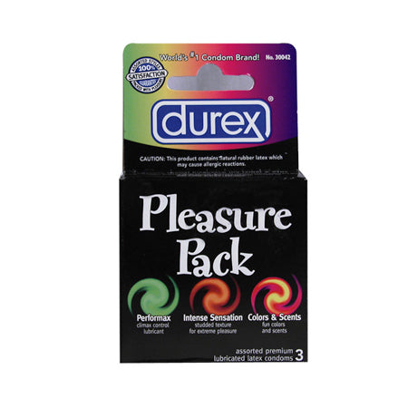 Durex Pleasure Pack (3 Pack)Durex Pleasure Pack assorted condoms put some adventure in your love life. The assortment contains Performax, with climax control lubricant, Intense Sensation which is studded, and Tropical Flavors. All are made out of Latex.