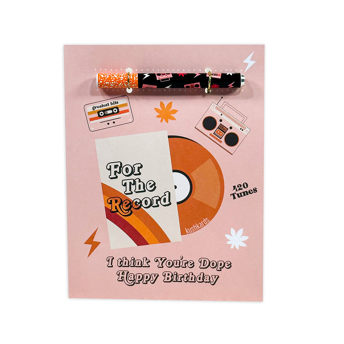 You are DOPE and for the record, here is something to show it! Shop our brand new, "For the Record" Birthday Cannabis Greeting Card for any music lovers in your life. With a retro vibe this birthday card is perfect for your hippie stoner friend. Grab it with the matching one hitter and add your own flowers. Say happy birthday with KushKards, a gift with a lift!