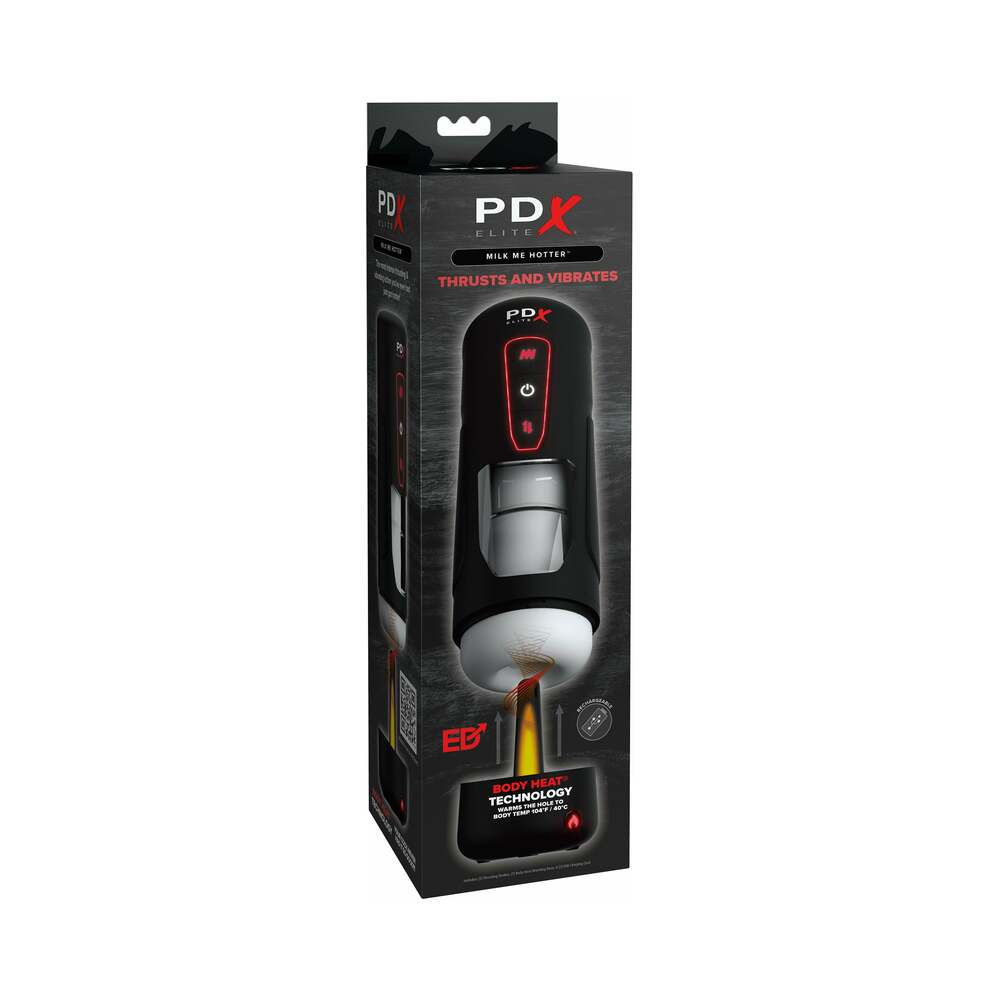 The PDX ELITE Milk Me Hotter elevates masturbation with powerful intermittent thrusting for the ultimate stroker experience It's a perfect storm of sensation for heightened solo sex sessions that can be customized to your personal moods!Get ready for explosive handsfree thrusting, surrounding your penis with ultrasoft, automatic stroking action! Watch all the stroking through the transparent window!Your ultimate masturbation experience is ready when you are!Item Width: 3.6 in. (9.4 cm)Item Weight: 2.2 lbs. (35 oz.)Penetrable Length: 4.5 in. (11.4 cm)Materials: ABS Plastic & TPEThrusts: YesMultispeed: YesVibrates: YesWarms: YesIPX Rating: IPX4 Stroker, IPX0 Warming BaseBattery Type: RechargeableCharge Time: 120 min.Charger Type: USB-C