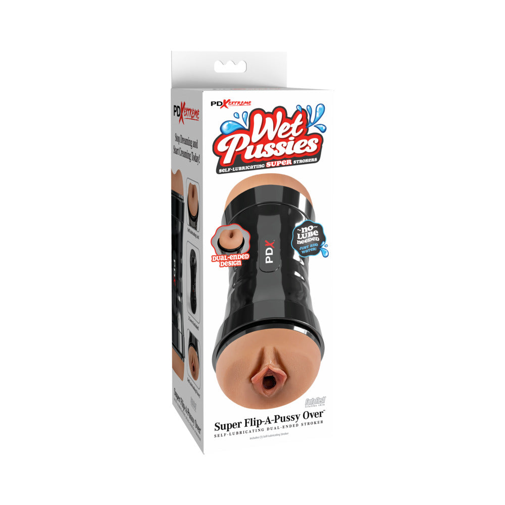 Get ready for double the fun with the Wet Pussies Super Flip-A-Pussy Over! This dual-ended stroker features a realistic pussy and ass stroker on both ends to make sure you get exactly what you came for. Both sides are self-lubricating, so all it takes is a little water, and your stroker turns into a pleasure zone of slippery orgasmic fun x 2!Designed with realistic details and a stimulating pleasure tunnel, you can be sure that this stroker LOOKS and FEELS better than the real thing! The ergonomic case protects your stroker and acts as discreet storage. It also features our EZ-Grip design for comfort and easy handling.So stop dreaming about pussy and ass and start creaming in them today!Dual-ended strokerSelf-Lubricating! Just add water!Sleek black casing for easy handlingInterior pleasure tunnelRealistic Fanta-Flesh material looks and feels just like the real thingComfortable EZ-Grip Design2 Storage caps one for each end Materials: TPR and ABS PlasticWarranty Period: 1-Year Limited WarrantyTotal Length: 9.1 in. (23.0 cm)Total Width: 3.6 in. (9.2 cm)Total Weight: 1.6 lbs. (0.73 kg)Penetrable Length: 7.9 in. (20.0 cm)