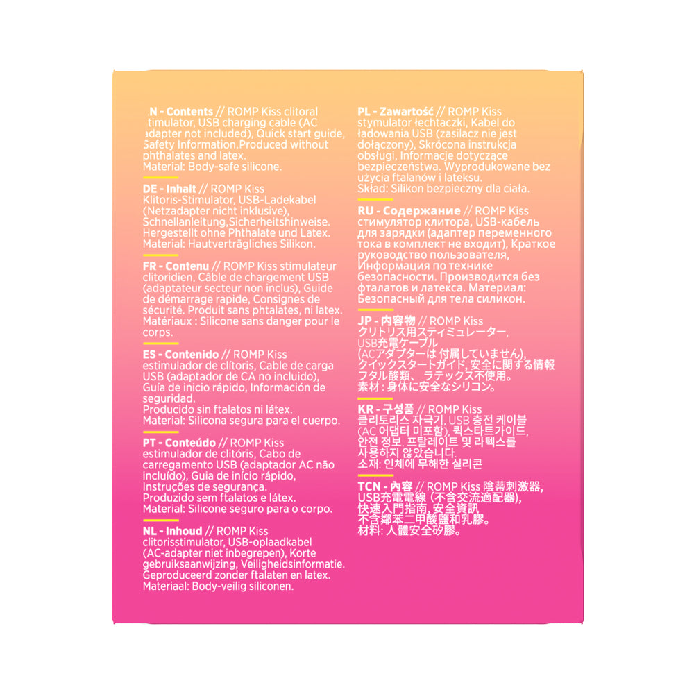 - It's Getting Intense: From a gentle wave to the peaks of pleasure, ROMP Kiss clitoral suction has 3 different intensity settings to deliver the right level of stimulation for your mood and arousal.