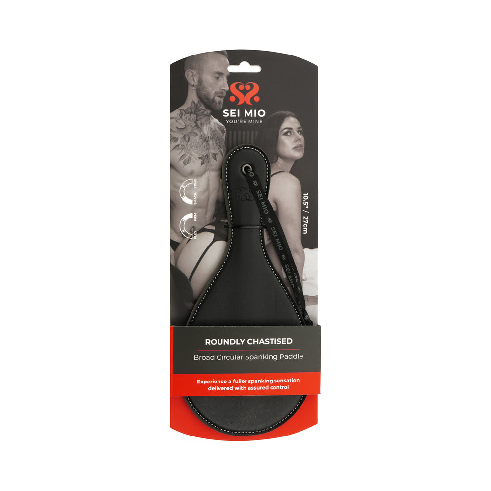 Take sensation play to new depths with the Sei Mio Roundly Chastised Spanking Paddle, designed with an expansive circular surface to deliver maximum impact. Wider than traditional paddles, this broad beauty ensures each swing reaches every inch of your partner's posterior, spreading sensation for a satisfyingly deep, full-bodied response.Crafted for both impact and control, the Roundly Chastised Paddle lets you adjust intensity effortlessly, making it ideal for everything from gentle taps to more thrilling strokes. Its comfortable grip and striking design promise a powerful blend of pleasure and playfulness in every session.Wrist loop for increased controlBroad Round paddle for spanking sensation playEasy to clean faux leather