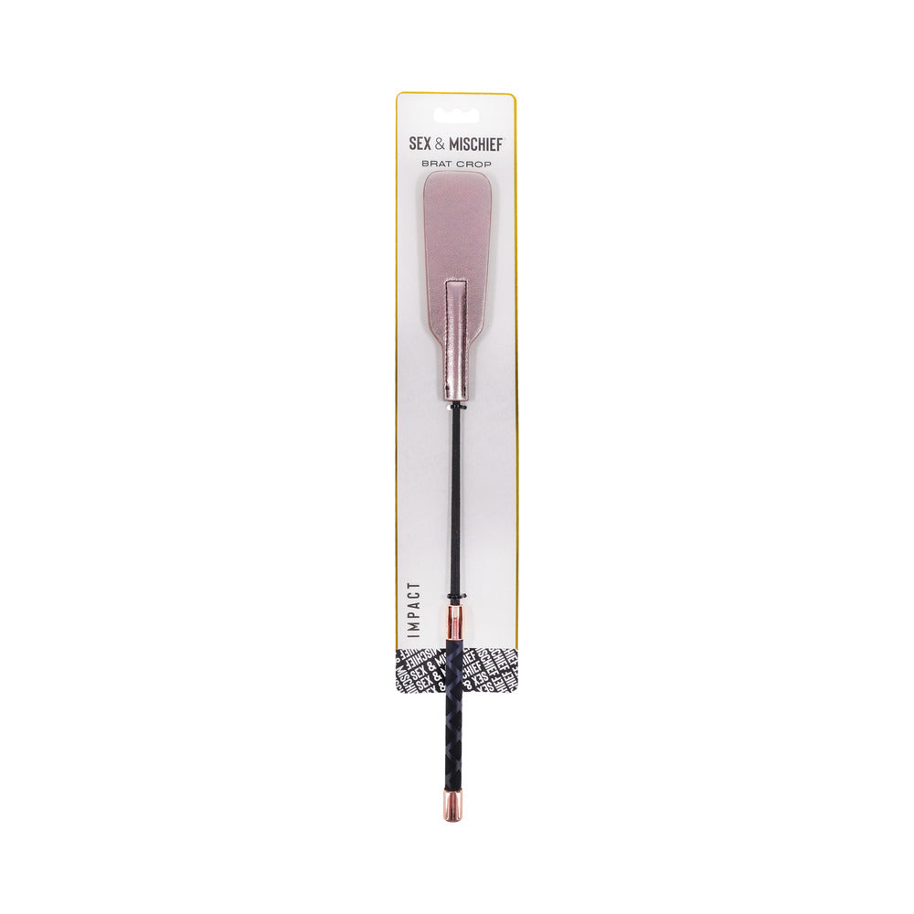 Take command and show your brat who's in charge with the Brat Crop! Ramp up your play with subtle taps, playing with sensations across their body with the split tipped rose gold vegan leather before inflicting an intense smack with a satisfying snap. Perfectly crafted to extend your reach for sensual impact play in a stylish and captivating display of dominance.Stunning rose gold finishes6.5" split vegan leather tip18.5" shaft with rubberized handle for easy gripMaterials: 60% PVC, 20% Glass fiber, 10% Zinc alloy, 10% PolyesterPackaging type: Hang CardPackaging: 17.25" H x 3.5" W x 0.57" D
