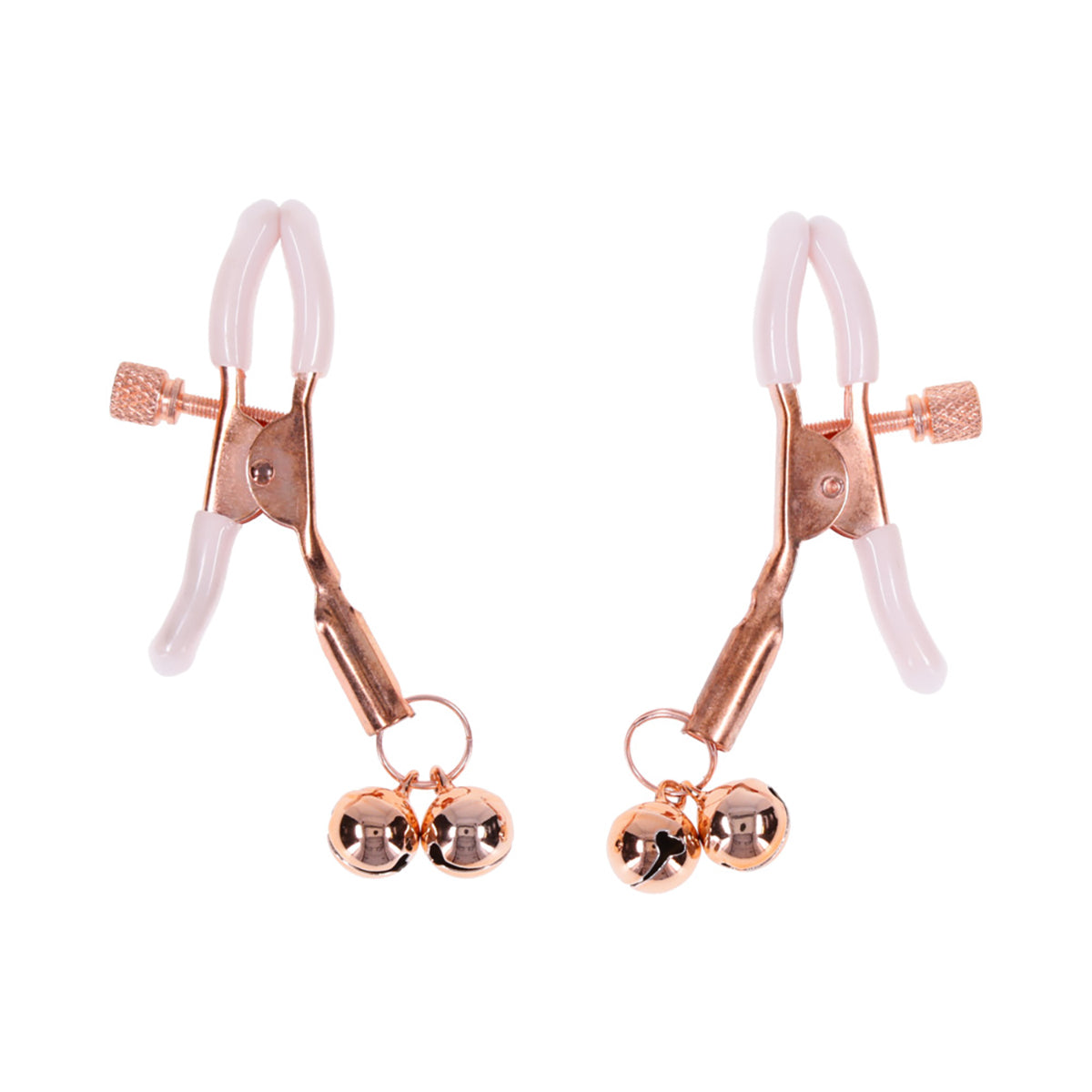 Ding, ding, ding! You've made the right choice with the Peaches 'N CreaMe Bell Nipple Clamps. Adjustable to cling as firmly as you like, just dial up the pressure to match your mood. Wrapped in soft body-safe rubber for comfort and grip, these clamps stimulate blood flow for heightened sensitivity. Adorned with rose gold bells that jingle with every movement, signaling that playtime is in full swing. Let the bells chime as you tease your way to bliss.