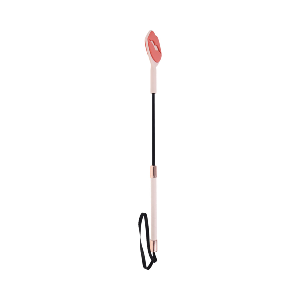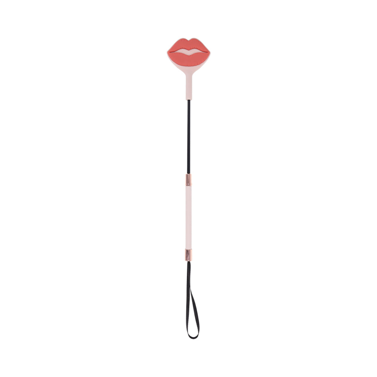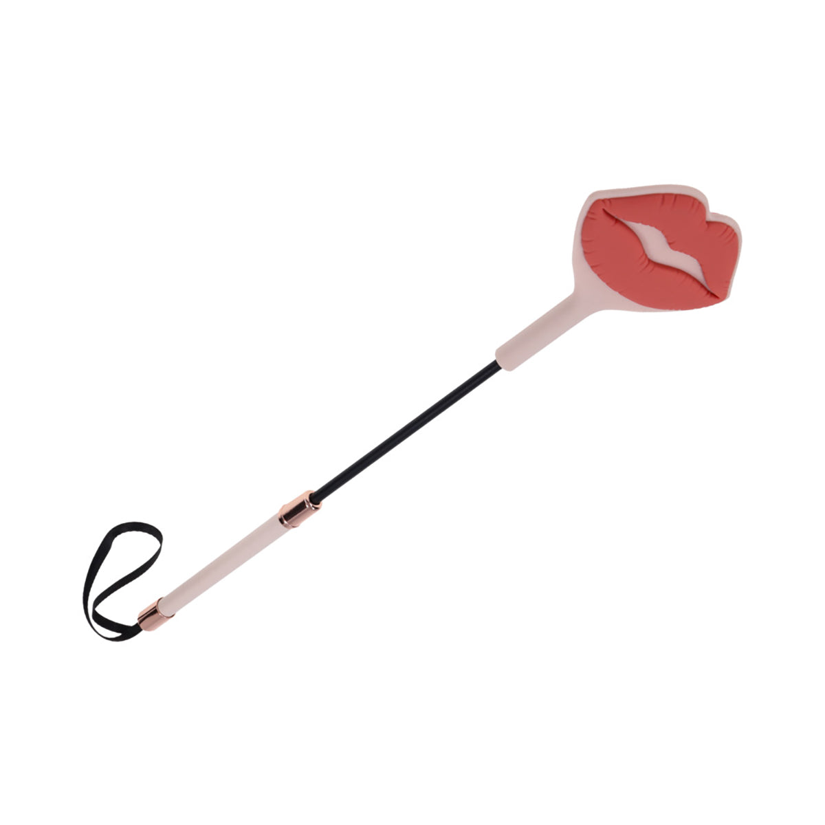 Seal the deal with a kiss they won't forget. The Peaches 'N CreaMe Kiss Crop features a soft, 100% silicone tip with a raised lip design that leaves a juicy kiss imprint with every well-aimed swat. The flexible yet firm tip delivers a sharp, satisfying sting that lingers on the skin and even longer in their memory. Adorned with gleaming rose gold accents and wrapped in peachy faux leather, the handle feels just as good in your grip as it looks. A matching wrist loop makes storage simple and impromptu play irresistible. With its flirty design and striking bite, this crop leaves a sensual mark that says, loud and clear: you were here.