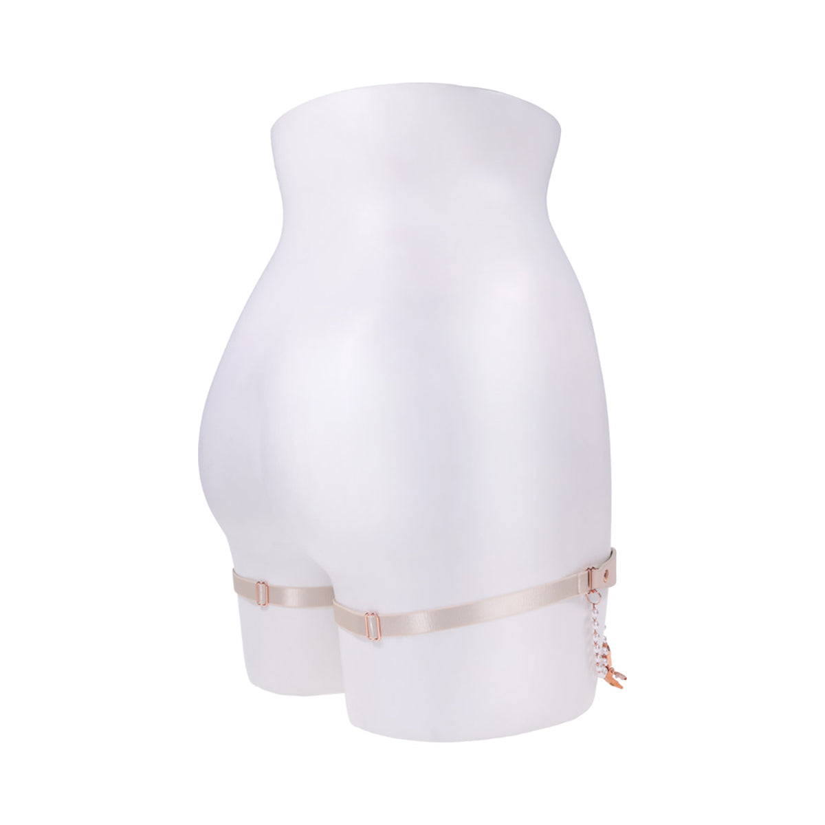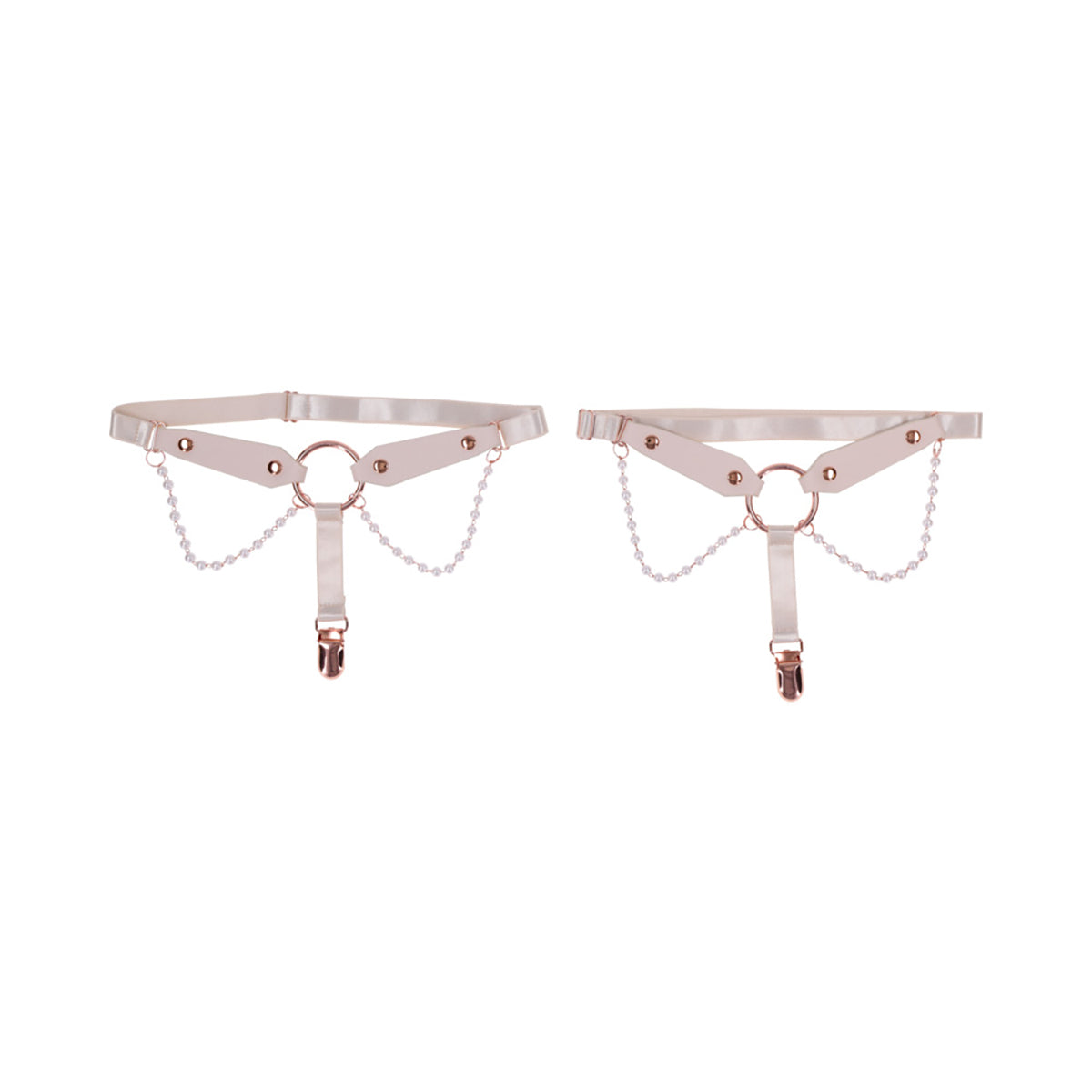 These luscious Peaches 'N CreaMe Garters are made to turn heads and raise pulses. Crafted from soft faux leather and adorned with delicate pearl strands, a gleaming rose gold O Ring, and functional garter clips, they blend elegance with irresistible edge. Fully adjustable for a perfect fit, they wrap your thighs like a sensual secret, tempting anyone within view to take a closer look or a daring bite. The secure clips hold your thigh highs in place, letting you strut with confidence and command attention at every step. Seduce with style, tease with power, once they catch a glimpse, they'll follow your lead without question.