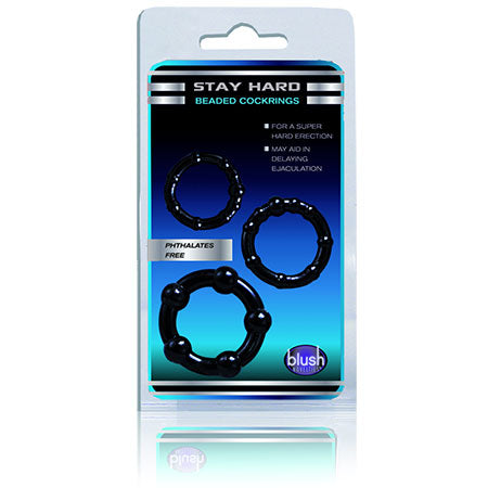 Perform like the stud you are! These Stay Hard Beaded C Rings come in 3 sizes, 1.35, 1.5, 1.7 inches, so you can use them individually or all 3 at once. The Small Ring is for maximum erections; Medium Ring is for hard erections; Large Ring can be used to encircle the upper part of your scrotum to help prevent premature ejaculation. They are made of body safe TPE, a super stretchy, comfortable and Phthalate Free material developed specifically for your safety and hygiene during your intimate play. So, if you're looking for a safe way to increase both in size and stamina, you and your partner are sure to enjoy Blush's Stay Hard Beaded C Ring and your bigger, better erection that lasts even longer! Wash with soap and water between uses. Air dry. Stores best in the original packaging.Three Sizes: 1.25 Inches, 1.3 Inches, 1.5 InchesSoft And StretchyIncrease Stamina & Enjoy Harder ErectionsStrong, Tear Resistant ElastomerMade from TPE. Contains no Fragrances, Phthalates, Paraffins or Latex